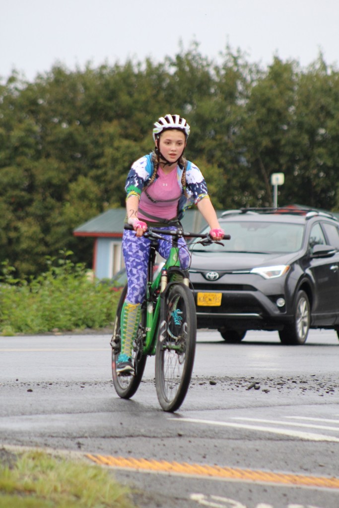 Ella Blanton-Yourkowski rides her bike across the intersection of Spit Road and Kachemak Drive. The triathlon had a person posted with a stop sign at intersections where competitors has to cross street to alert traffic to the presence of runners and bikers.