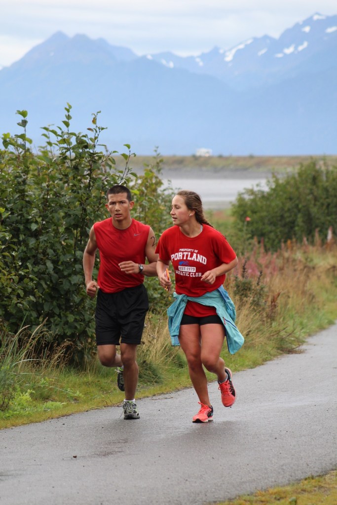 Kane Graham and Lauren Kuhns keep pace with each other as they run back down the Spit, making their way back to the high school where the finish line for the three-part race was located.  Graham finished second overall in the triathlon and Kuhns finished third overall, three seconds behind Graham.