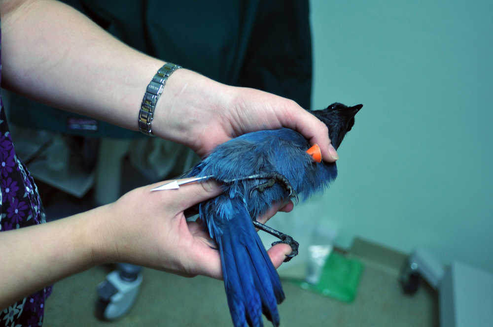 Broshes had to use bolt cutters to cut off the barbed end. One dart slipped out easy, but in the second bird, the vets had to sedate the Steller’s jay because the dart had gone deeper in its back.