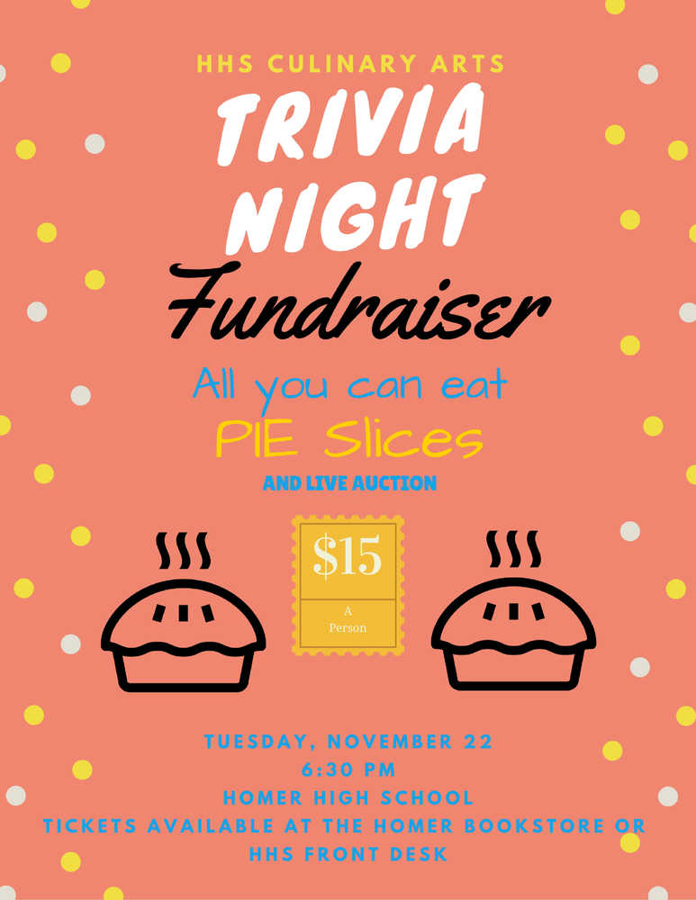 Homer High School’s culinary arts class is holding a trivia night with a live auction and all-you-can-eat slices of pie on Nov. 22 at 6:30 p.m. at Homer High School. Tickets are $15 per person and are available at the Homer Bookstore or Homer High School front desk. The funds will help offset the cost of food necessary to provide the culinary arts classes to the students at Homer High.