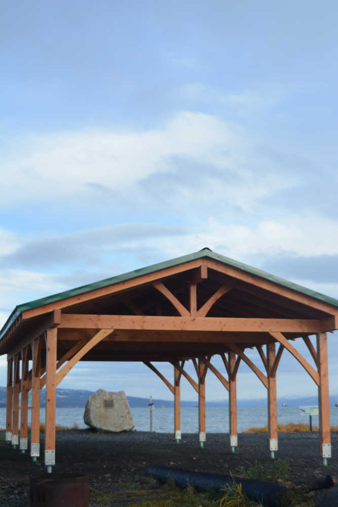 A new picnic pavilion near the Nick Dudiak Fishing Lagoon and at the trailhead and kayak launch site for the Kachemak Bay Water Trail was completed last week. The pavilion in the campground by the fishing hole and Pier One Theatre replaces a picnic shelter torn down several years ago that had been by the Homer Spit Road. Last week, volunteer builders finished attaching the green-metal roof to the timber-frame structure.