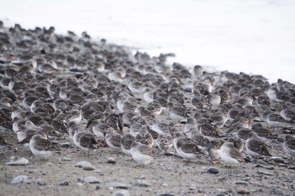 A flock of rock sandpipers scatters after a big wave hit the beach at Mariner Park on the Homer Spit last Saturday. Rock sandpipers return to Kachemak Bay in the fall and can be seen in big groups on the spit.
