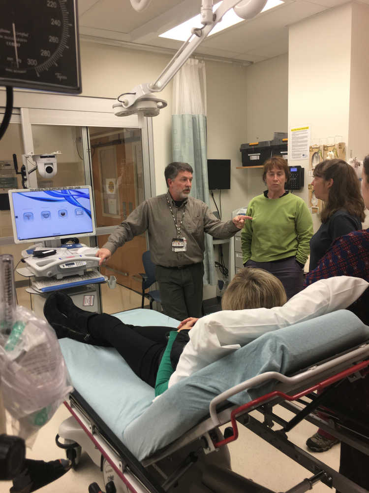 South Peninsula Hospital Emergency Room physicians participate in a recent training on new tele-stroke equipment and service now available at SPH. ER physicians attending included Drs. Martha Cotten and Guilia Tortora, both standing in center, who are listening to one of the trainers from Providence Alaska Medical Center in Anchorage. -Photo provided
