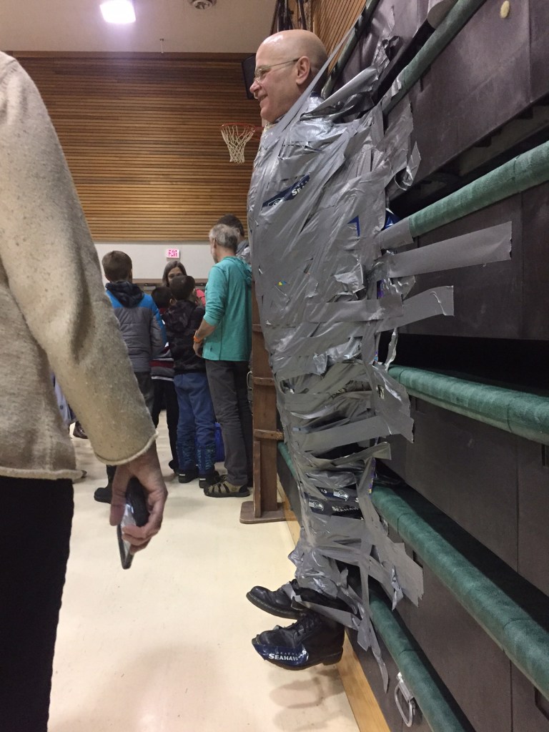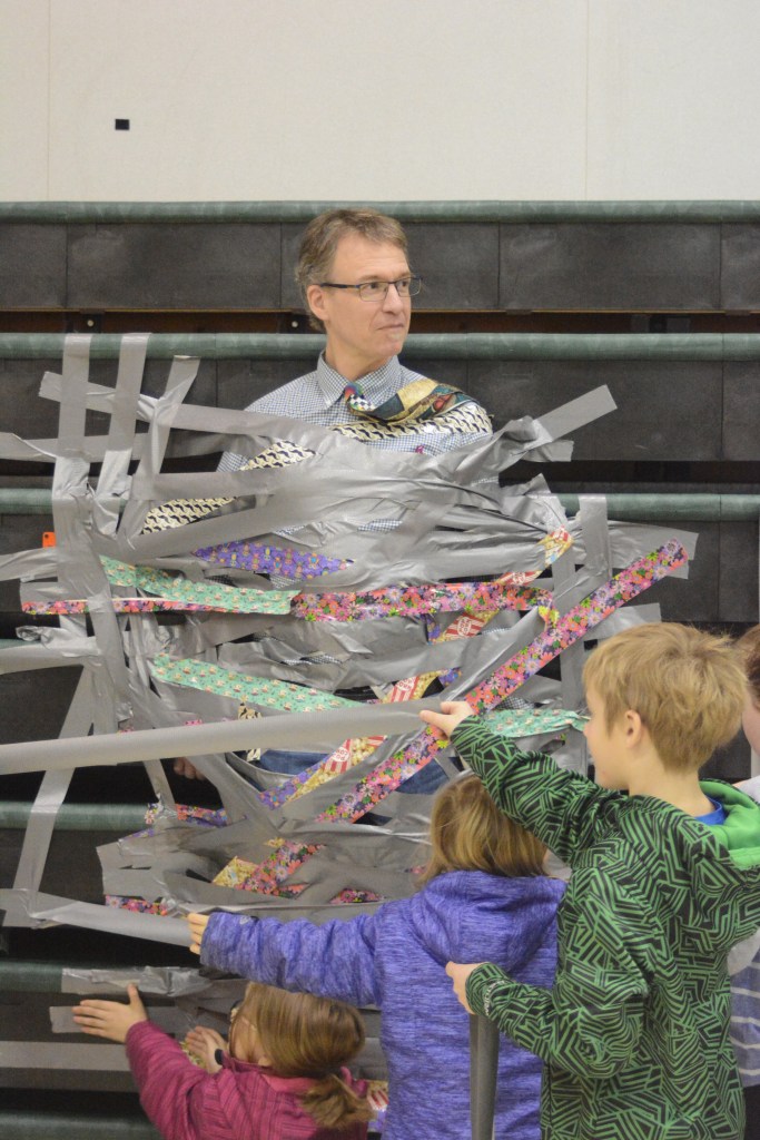 Students at West Homer Elementary School and Fireweed Academy last Thursday got a special treat: the chance to duct tape their principals to the wall of the school’s multipurpose room. As teachers peeled off strips of dull-gray but also brightly colored duct tape, West Homer Elementary Principal Eric Waltenbaugh and Fireweed Academy Principal Todd Hindmanprincipals stood on milk crates and bravely endured hundreds of little hands taping them to the wall. After about an hour, layers of duct tape covered their bodies so that they looked like caterpillars ready to emerge from their cocoons.