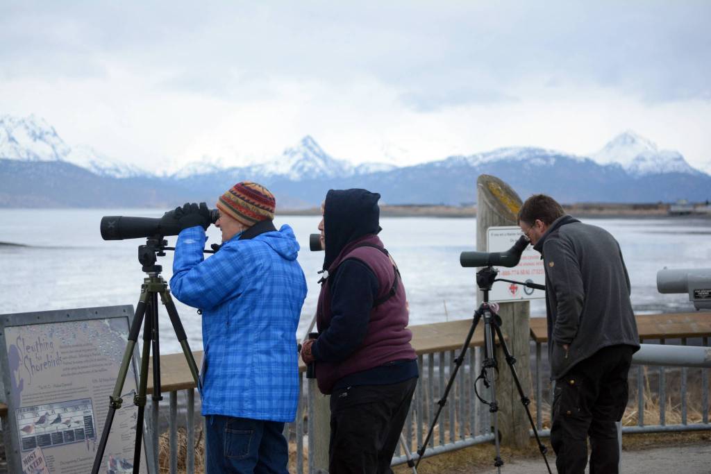 7) 6:30 p.m. today, Beluga Lake lower platform off FAA (Airport) Road. Evening at the Marsh. Birders Aaron Lang and Michael Craig help people spot birds on the shore of the lake.