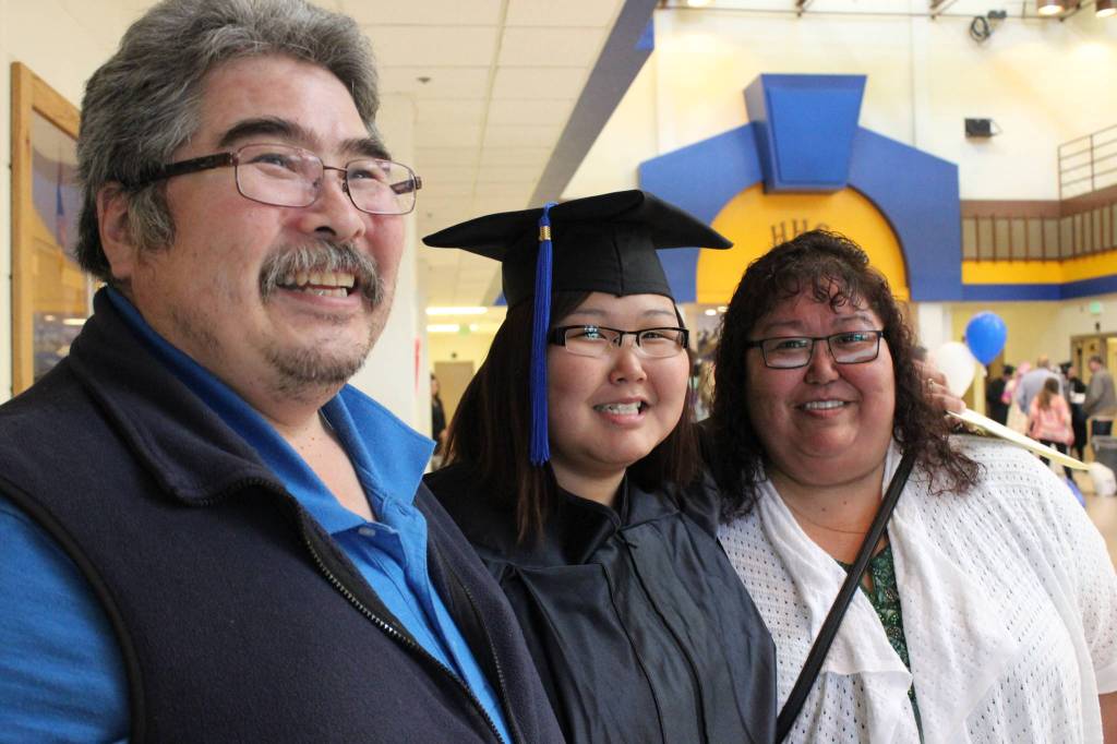 Before filing into Mariner Theatre with other graduates and receiving her General Education Development diploma, Megan Kalmakoff and her parents Harry and Nana Kalmakoff, happily posed for photos and recalled the family’s move from Chignik Lake to Homer.