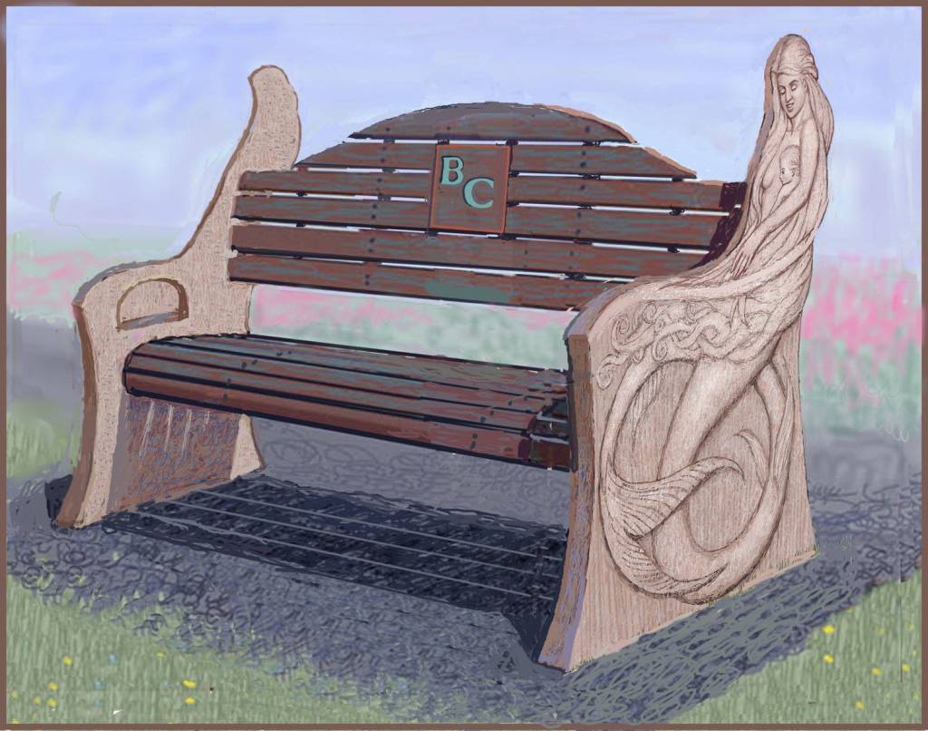 The bench design settled on by the Frys and Hughes has a seat and back of curved metal lathes. The cement ends of the bench have been made by Hughes to look like a mermaid, her top half appears to be above the water’s surface, her hair and mermaid tail seem to swirl in the current. From the left side of the bench can be seen the mermaid’s face as she looks down at the infant cradled in one arm. From the right, her other arm drops to her side, the fingers curved.