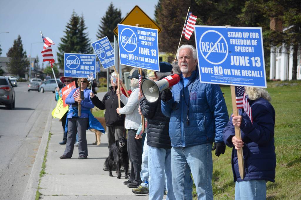 Tuesday saw steady campaigning throughout the day, with opponents and supporters of the recall — sometimes together— waving signs and U.S. flags on Pioneer Avenue. In terms of enthusiasm and numbers, the anti-recall group had more feet on the street. One supporter, Stuart Schmutzler, wore his Clan Stuart kilt. Supporters blew whistles and held up pinwheels in the brisk Kachemak Bay day breeze.