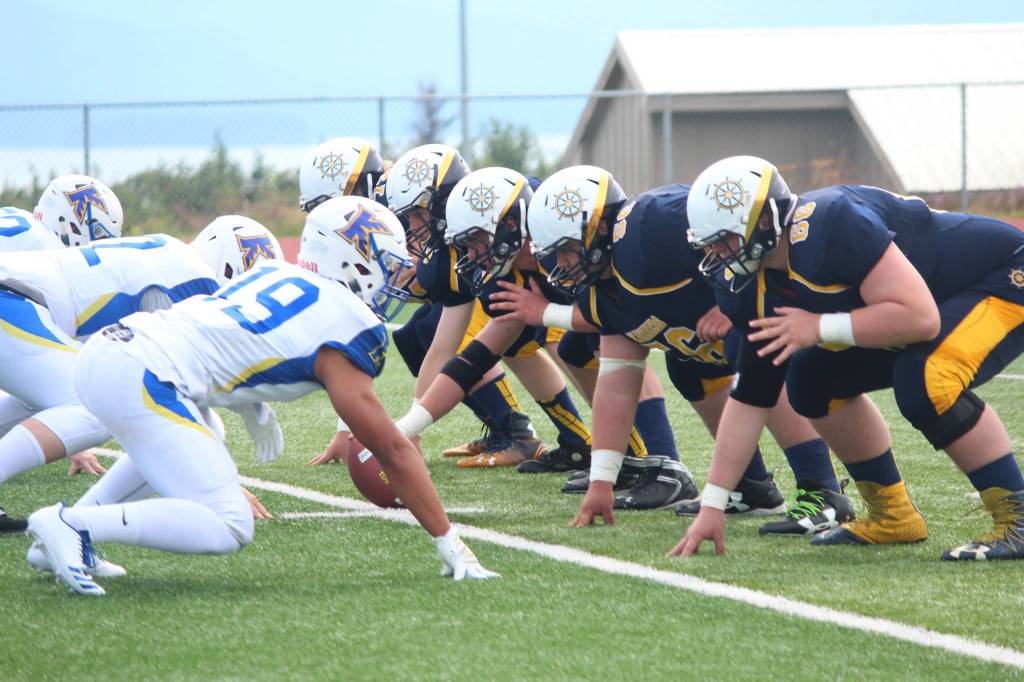 Members of the Homer Mariners varsity football team face off against those from Kodiak High School during their game Saturday, Aug. 12, 2017 at Homer High School in Homer, Alaska. Kodiak defeated the Mariners 21-8. (Photo by Megan Pacer/Homer News)