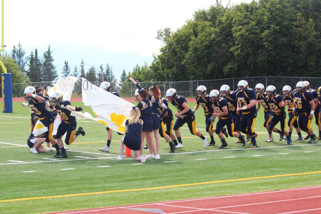 Members of the Homer Mariners varsity football team take the field for their game Saturday, Aug. 12, 2017 at Homer High School in Homer, Alaska. The Mariners lost to Kodiak 21-8. (Photo by Megan Pacer/Homer News)