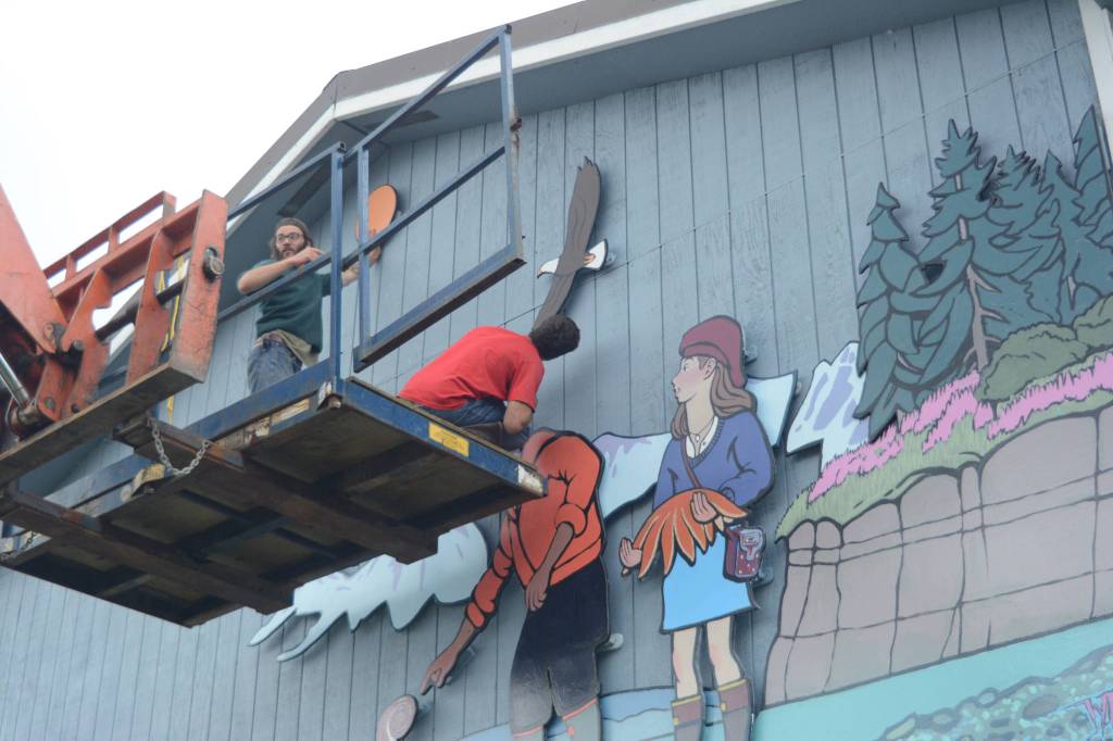 Artist Brad Hughes installed a new mural at last Friday at the Center for Alaskan Coastal Studies. Part of a 35th anniversary remodeling effort to make the environmental education nonprofit’s building more visible, the mural shows two children wading in a tidepool and exploring marine life. Words on the mural encourage people to “explore, connect, protect.” In a nod to classical imagery, a boy reaches out to touch an octopus, an allusion to Michelangelo’s “The Creation of Adam” mural on the Sistine Chapel. The remodel will include more murals on the side and front of the building.