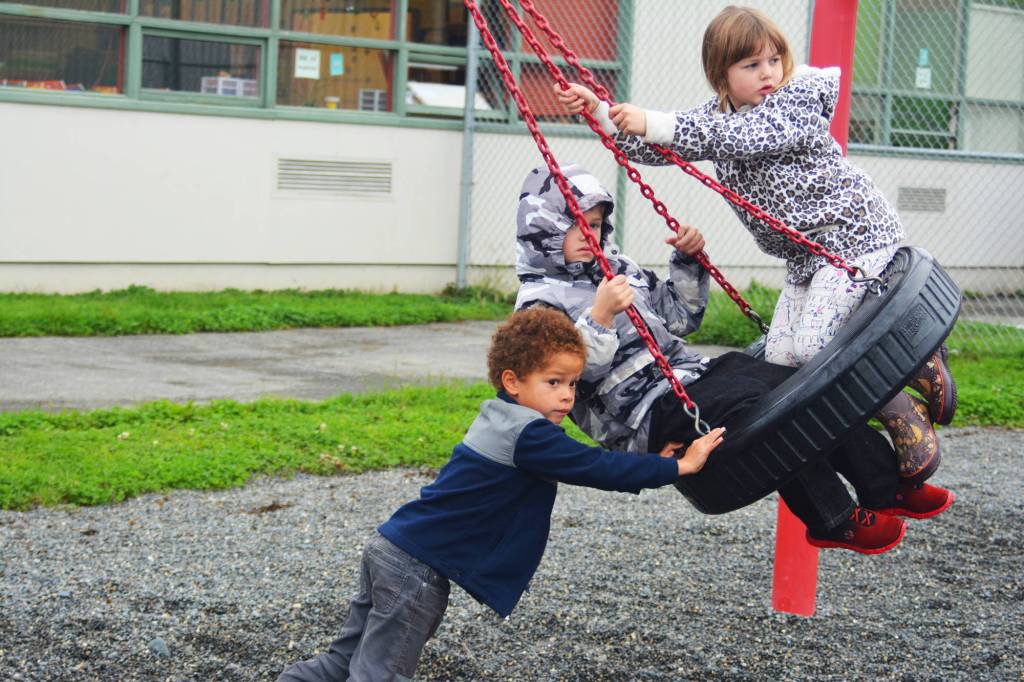 Elijah Williams pushes Adrian Reutov and Autumn Read on a swing during recess on the first day of school Tuesday, Aug. 22, 2017 at Paul Banks Elementary in Homer, Alaska. (Photo by Megan Pacer/Homer News)
