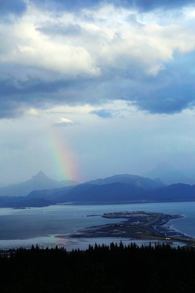 A rainbow appears over Kachemak Bay and Poot Peak on Monday, Sept. 4, 2017 in Homer, Alaska. (Photo by Michael Armstrong/Homer News)