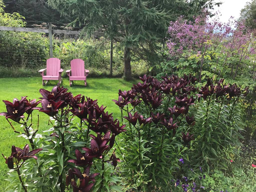 The perennial beds are tattered. The wind we’ve been experiencing has taken a toll. But, if you don’t have asiatic lilies in your garden you are missing a treat. The ones here are firmly established and bloom at various times throughout the growing season. Blooming right now is “Near Black” and it has the unfortunate lot in life to belong to me. No planning, just clumped out there. Really and truly, my best intention is to spread them out come spring. Cross your fingers. They are gorgeous and deserve more. I planted them in the aftermath of the “Winter of 2012” when we were encased in ice and almost everything suffocated. Tragedy. While Homer was being “iced” I was at the Northwest Flower and Garden Show, oblivious of what was happening here. While there I was drawn to the lilies and came home with way too many. When the ice melted and I was able to assess the damage, my good intentions for those bulbs also melted. I just stuck them in the ground and there they are to this day, hale and hardy. Goodness.