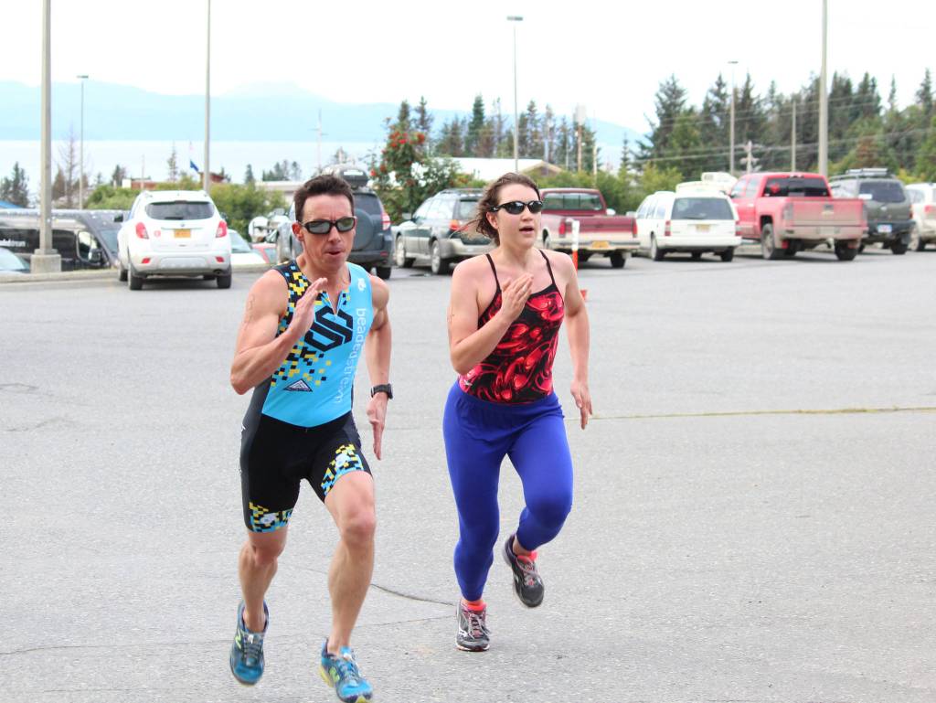 A total of 105 competitors racing as individuals and on teams completed a 1,000-yard swim in the Homer High School pool before hopping on bikes for a 15-mile cycle up East Hill Road, along Skyline and down the Homer Spit, followed by a 5 mile run from the Nick Dudiak Fishing Lagoon back to Homer High School.