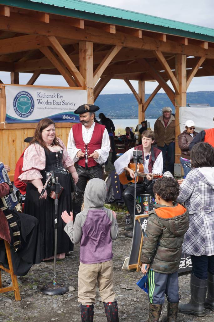 Erin Searcy-Dudgeon Wells of Rogues & Wenches, center, leads a sing along at the Kachemak Bay Wooden Boat Society Festival on Saturday, Sept. 2, 2017 at the Nick Dudiak Fishing Lagoon campground in Homer, Alaska. At left are Lucia Woofter and Lena Gonzales. At far right is Hunter Woofter, Devin Frey, second from right, and Bob Woofter, (Photo by Michael Armstrong, Homer News)