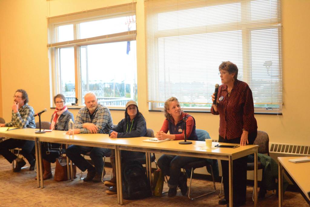 Homer City Council candidate Caroline Venuti, right, speaks at a candidates forum on Thursday, Sept. 21, at Kachemak Bay Campus. Sponsored by KBBI Public Radio, the candidates answered questions from the audience as well as from KBBI and Homer News reporters. From left to right are candidates Andy Kita, Sarah Vance, Dwayne Nustvold Jr., Kimberly Ketter, Rachel Lord and Venuti. Candidate Stephen Mueller could not make the Sept. 21 forum because of a family commitment, but he did attend a Sept. 28 forum at the Homer Elks Lodge sponsored by the Homer Chamber of Commerce and Visitors Center. (Photo by Michael Armstrong, Homer News)