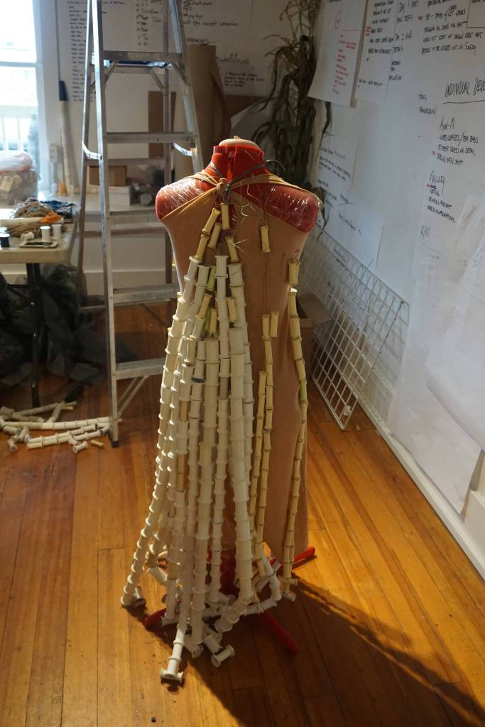 Wearable Arts challenges fiber artists to create couture in both traditional (i.e., stitched or knit fabric) as well as avant garde forms. An exhibit of Wyne’s fashion shows where she falls on the wearable spectrum. One piece, Polar Wear, made of 1,000 plastic straws, mimics the hollow shaft fur of a polar bear. Another dress, Princess Buzzkill, has a hoop skirt of old bandsaw blades and a necklace of a saw blade.