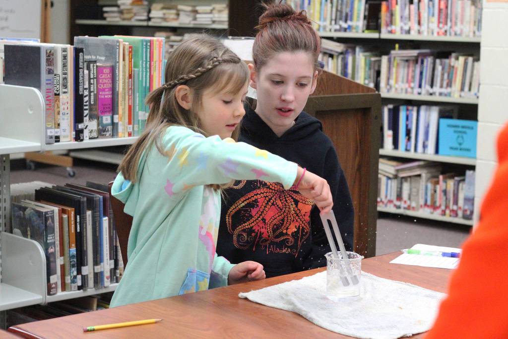 Wendy Todd’s first grade class from Paul Banks Elementary made the trek up to Homer Middle School on Tuesday morning, and were guided through a hands-on science lesson with five different stations by members of Jennifer Bozz’s eight grade class.