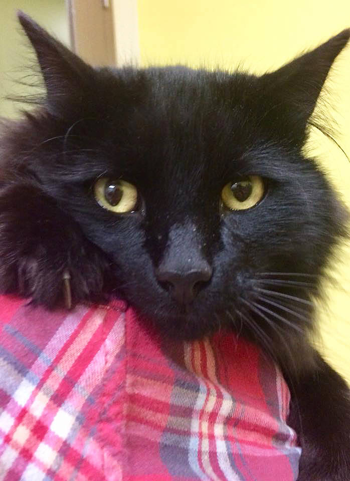 Houston, we have a nuzzler. Check out this beefy boy — his name is Fuzzy and he is a lover. (Polly’s not convinced, but she’s getting there.) If you wander into our catitorium today, you might think you’re seeing double as Polly and Fuzzy are both long-haired, jet black beauties. Fuzzy is big, and friendly, though he does get a little overzealous when it comes to love nibbles. We kinda like that about him. He’s got character, a strong presence and will walk right into your home ready to go.
