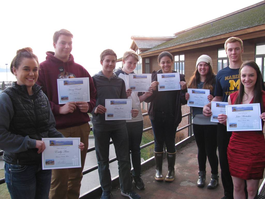 From left to right: Emily Arno, Henry Russell, Riley Jones, Emmet Wilkinson, Alexus Dawson, Kat Nelson, Levi King and Jalee Martushev display their Mariners on the Move awards on Nov. 15, 2017 at Homer High School in Homer, Alaska. (Photo by Paul Story)