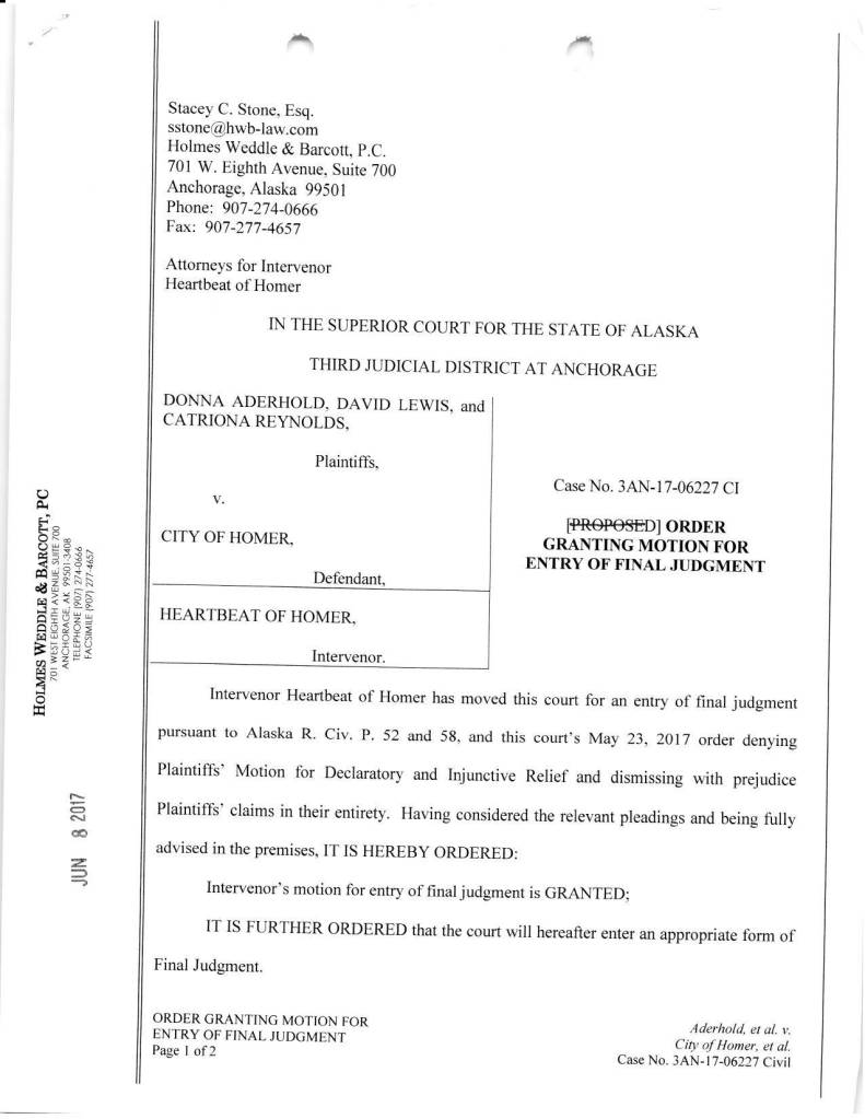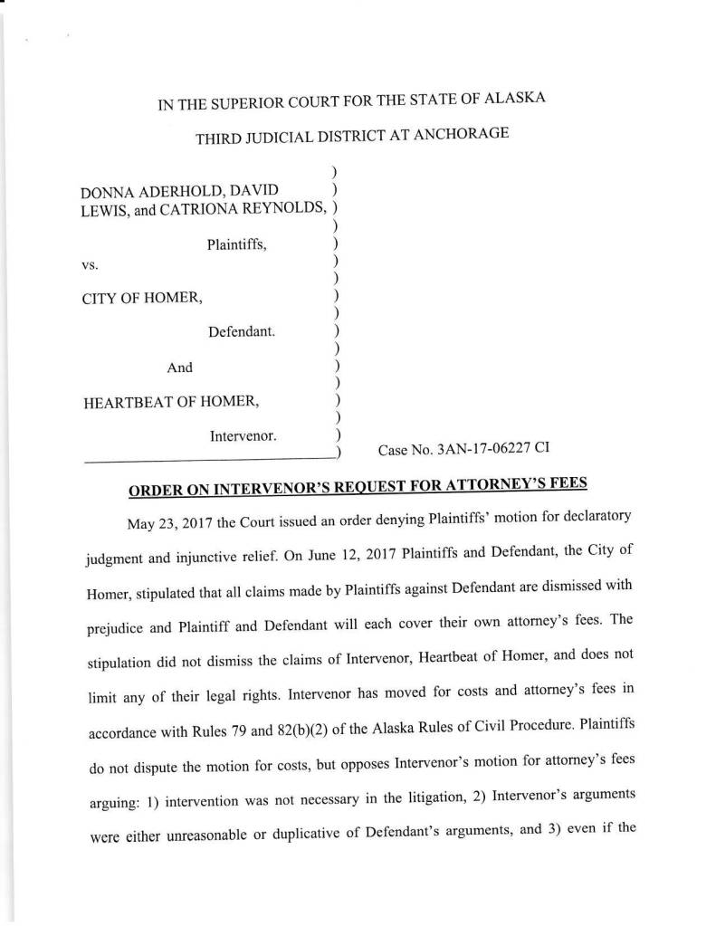 The plaintiffs also argued that Heartbeat of Homer shouldn’t receive attorney fees because they didn’t need to participate and their arguments were “duplicative or unreasonable,” Marston wrote. The judge rejected that argument. He said that while the city and Heartbeat of Homer had similar arguments, that was a result of their similar positions in the case and “does not make Intervenor’s participation or attorney’s fees unnecessary or unreasonable,” Marston wrote.