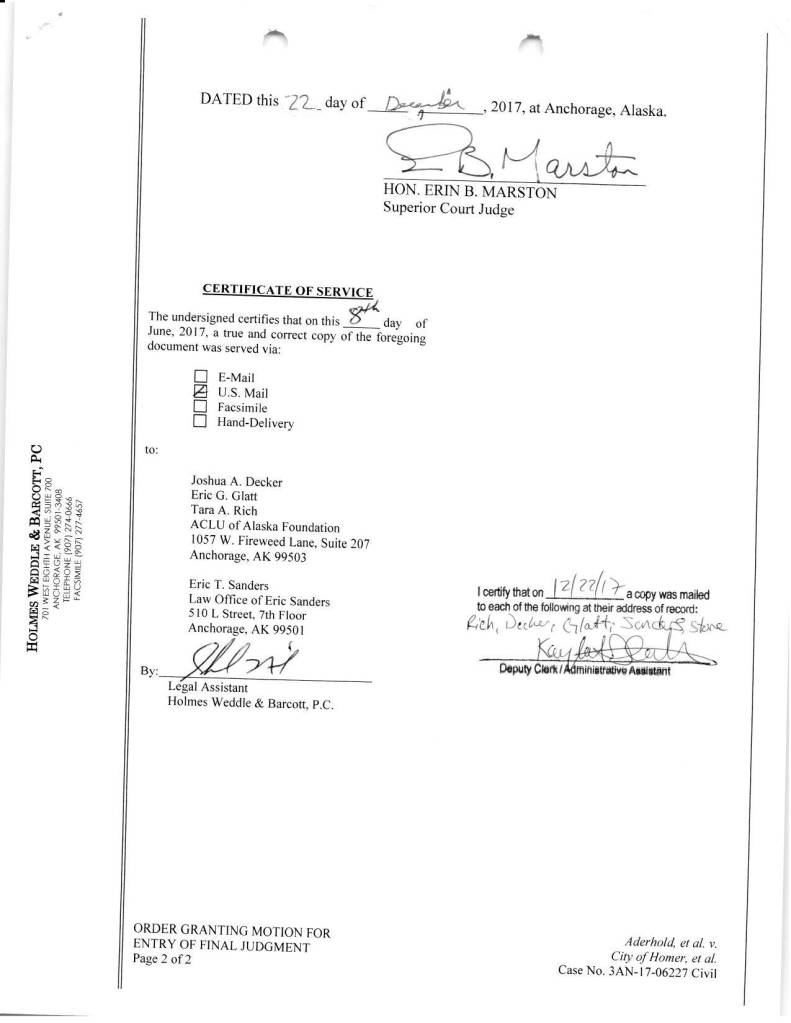 In an order and decision released on Dec. 22 regarding a city of Homer civil court decision, Anchorage Superior Court Judge Erin Marston made a ruling like King Solomon when he split in half the legally allowable attorney fees that the prevailing party could receive. In the Aderhold et al. v. City of Homer recall election case, the political action group Heartbeat of Homer — admitted as an intervenor on the side of the city — had asked for 75 percent of the $11,506 it paid in attorney fees.