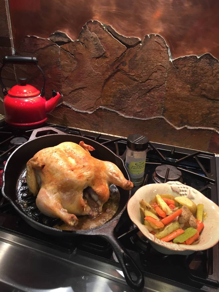 Use a combination of potatoes, carrots, onion and mushrooms (or whatever is your heart’s delight) cut into similar size pieces and tossed with olive oil and seasoned with salt and pepper roasted on a hot baking sheet. I enjoy the flavor of Herbs de Provence and will add a little of this herb blend to them prior to roasting. Roast your veggies while the chicken roasts, but veggies will be done before your bird, so when they are fork tender, take them out of the oven and transfer to a bowl and cover to keep warm.