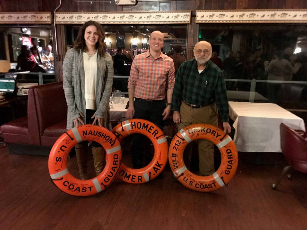 USCG Naushon and Hickory commanding officers present ship’s rescue rings for display in the Homer Elks Lodge dining room at a holiday party held for local Coast Guard on Dec. 14, 2017. Pictured left to right are Naushon Commander Lt. Lauren L. Milici, Hickory Commander Lt. Brent Mellen and Don Cotogno, Homer Elks Board Chairman. (Photo provided)