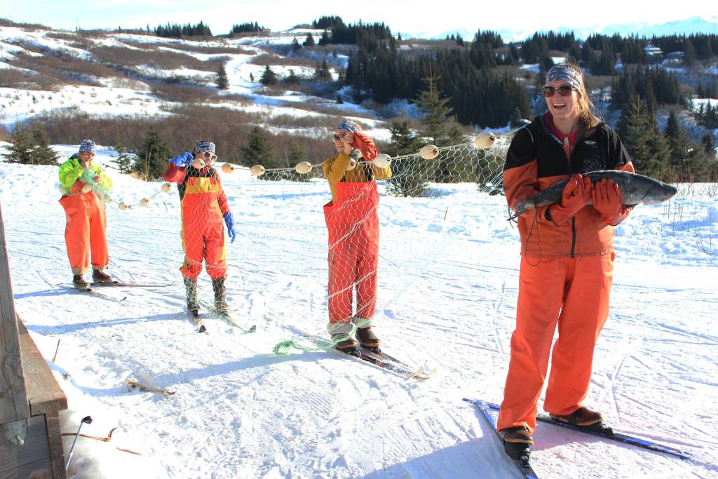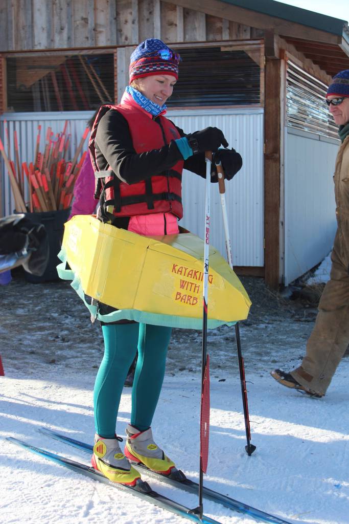 While a purple people eater pulled on her protective warm clothing, a group of commercial fishermen coordinated how they would hold their large fish net while skiing and a viking warrior princess skipped by on her way to registration.