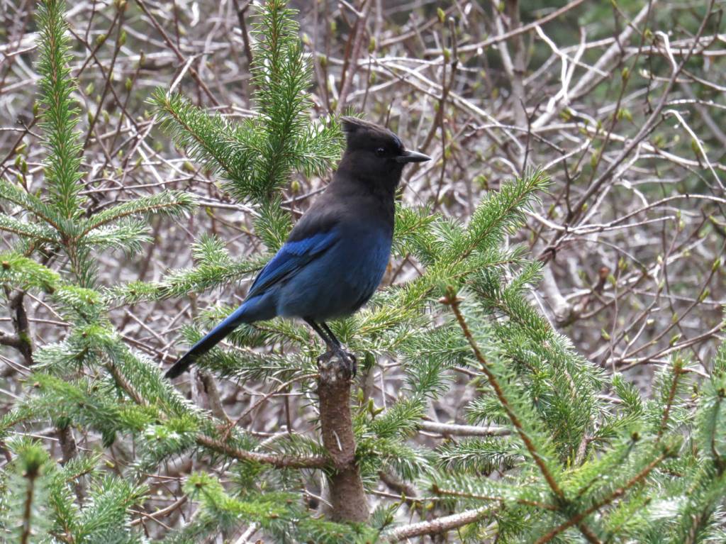 The Steller’s jay announces its presence with a loud call sometimes described as the sound of an old-fashioned pump handle needing grease. The Steller’s jay, like many of the Corvids, is an accomplished mimic, often mimicking the sound of a hawk, thus causing other birds to flee a good feeding site.
