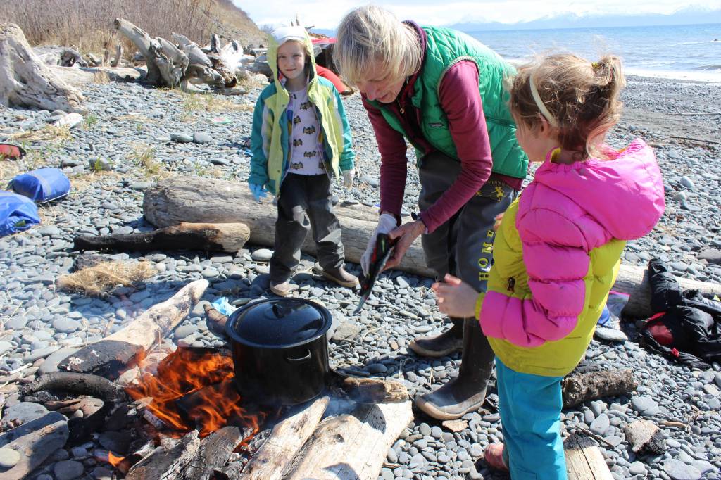 A May 2 outing for students in the Kenai Peninsula School District’s Wilderness Explorers program in Homer is an opportunity for volunteer Tania Spurkland (center) to teach Estelle Velsko (left) and Allie Barker (right) how to prepare stinging nettles over a campfire. (Photo by McKibben Jackinsky)