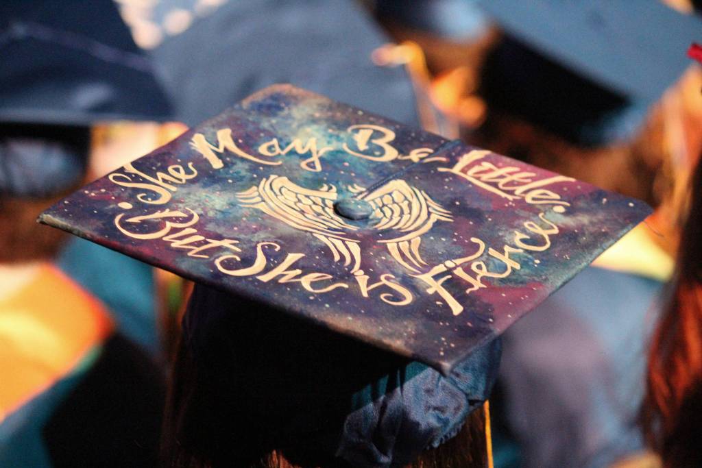 A Homer High School graduate with a cap decorated to say “She may be little, but she is fierce,” listens during the commencement ceremony for her graduating class Tuesday, May 22, 2018 at the school in Homer, Alaska. (Photo by Megan Pacer/Homer News)