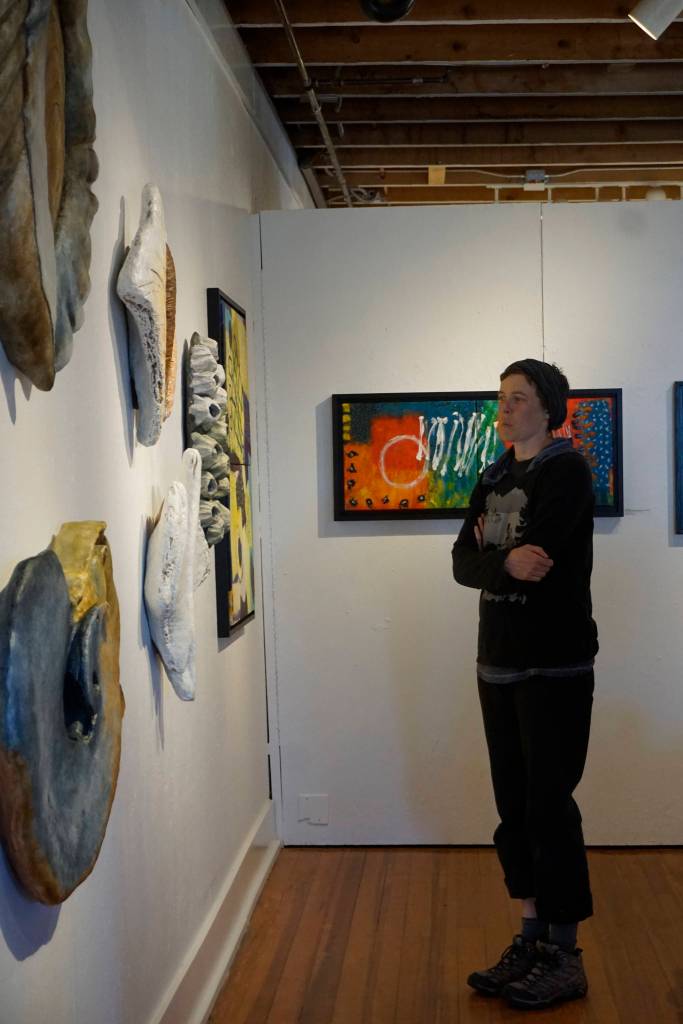 While this is her first gallery wide exhibit, Reichman has had pieces in Bunnell’s 10×10 show. She also won two city of Homer 1-percent for art commissions, “A Soulful Eye” at the End of the Road Park and hanging sculptures of a moose, bear and marine creatures at the West Pioneer Avenue public restrooms. All have survived Homer’s tough winters.