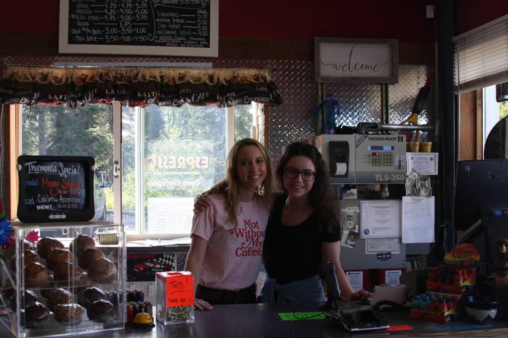 (From left to right) Thurmond’s employees Stacey Cole and Mikylla Blauvelt pose behind the front counter of Thurmond’s Far West Auto during the fourth annual Customer Appreciation Day on Saturday, June 9 in Anchor Point, Alaska. (Photo by Delcenia Cosman)