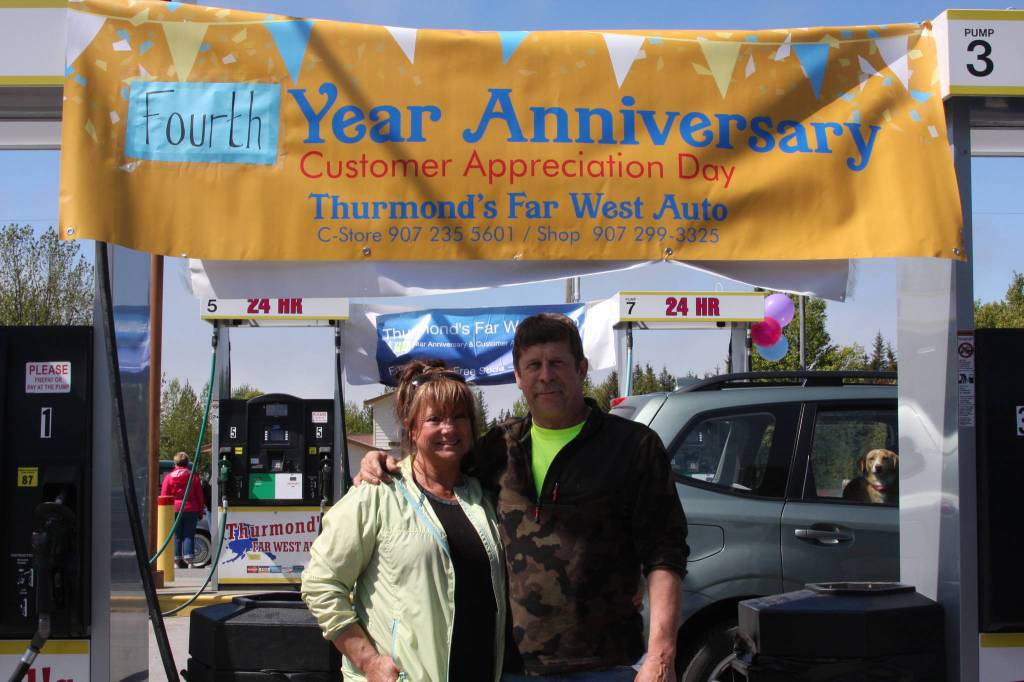 Photo by Delcenia Cosman Owner Elaine Griner and her husband Dale celebrate Thurmond’s Far West Auto’s fourth anniversary and Customer Appreciation Day on Saturday, June 9 in Anchor Point.