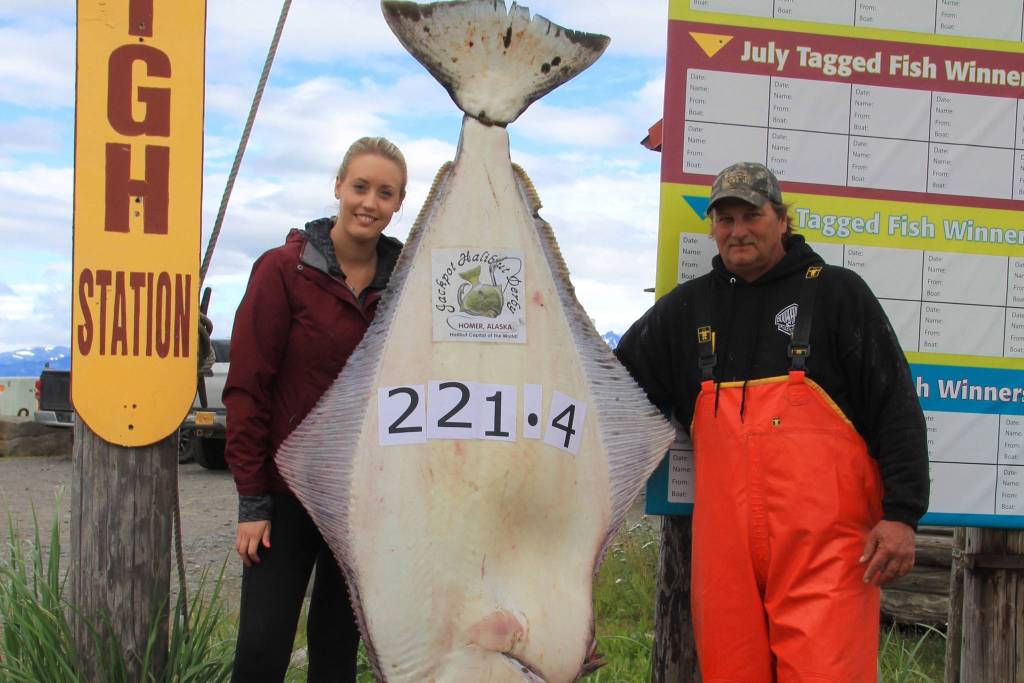 Ashley Camp of Vancouver now holds the top slot with a 221.4-pound, 76-inch halibut she caught July 28 while fishing with Captain Brian Nollar on the Bell Isles with Midnight Sun Charters.