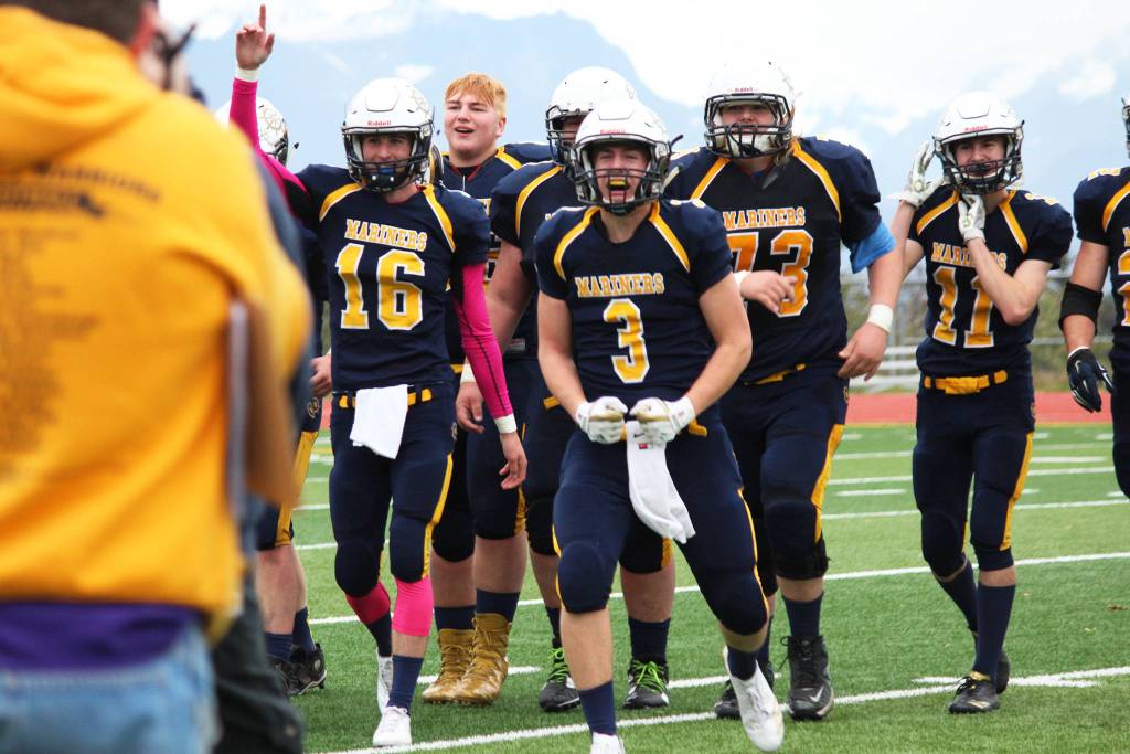 Justin Sumption (16) and Dawson Felde (3) come off the field celebrating with their teammates after defeating Ben Eielson High School in a playoff game Oct. 7, 2017 at Homer High School in Homer, Alaska. The Mariners went on to lose the ASAA First National Bowl Series Division III Championship game to the Barrow Whalers. (Photo by Megan Pacer/Homer News)