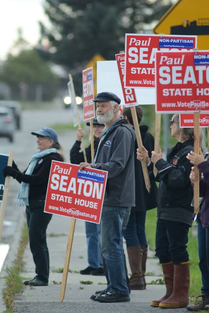 Rep. Paul Seaton, NP-Homer, center, is joined by supporters waving signs on primary election day, Aug. 21, 2018, at the corner of Lake Street and Pioneer Avenue in Homer. Seaton ran unapposed as a nonpartisan candidate for the Alaska Democratic Party seat. Also waving signs are supporters of Alyse Galvin, a nonpartisan candidate for the Democratic Party seat for U.S. Congress. Galvin won the Democratic Party nomination. (Photo by Michael Armstrong/Homer News)