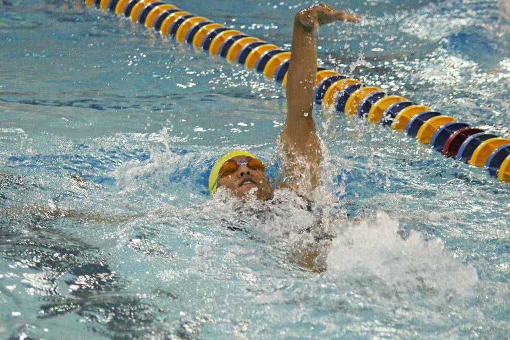 Homer’s Alia Bales competes in the girls’ 100-yard backstroke during the Homer Quad on Friday, Aug. 24, 2018 at the Kate Kuhns Aquatic Center in Homer, Alaska. (Photo by Megan Pacer/Homer News)