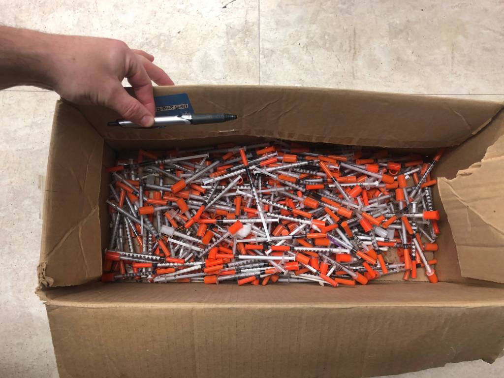 An employee of North Star Terminal on Sept. 11 turned in a box of about 100 used syringes and needles found behind the barge basin on the Homer Spit. Homer Police Chief Mark Robl said the syringes were picked up over the course of a few days.
