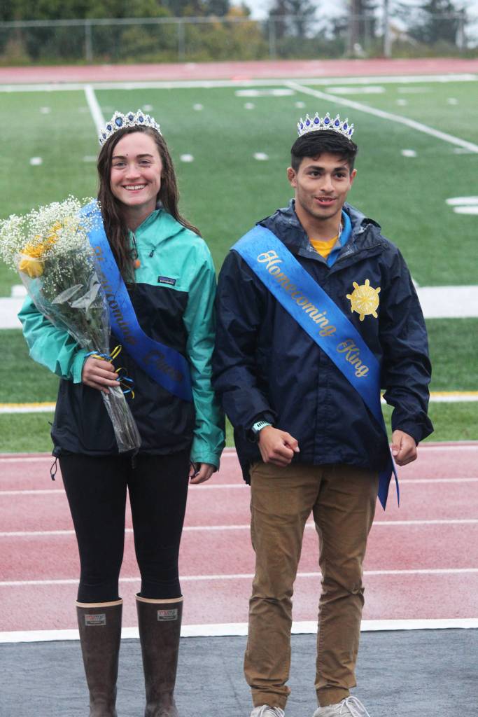 Seniors Ali McCarron and Luciano Fasulo stand for applause after being crowned Homecoming king and queen Friday, Sept. 21, 2018 at Homer High School in Homer, Alaska. The Mariners went on to win their game against Seward 21-20. (Photo by Megan Pacer/Homer News)