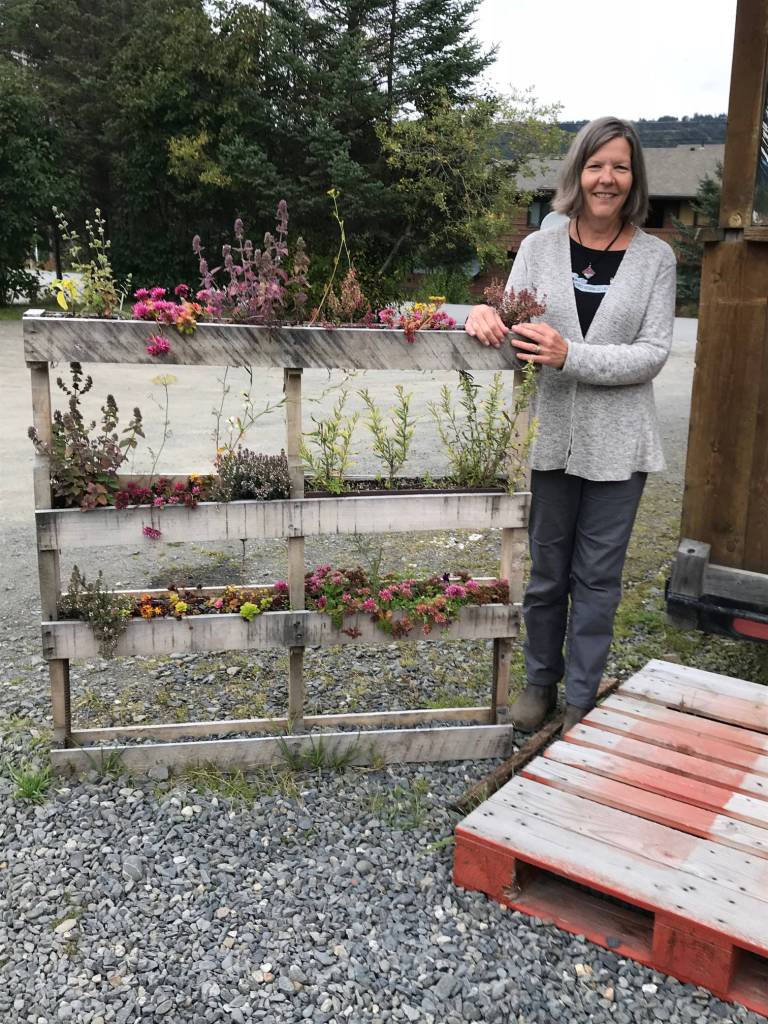 And that brings me to Homer Brewing. Co-owner Karen Berger has solved a sticky problem of demarcating parking from seating. The ingenious use of pallets turned on their side, secured with rebar, gravel for ballast in the bottom section, lined with plastic gutters and planted with mostly succulents is charming and functional. If you wish to adopt this idea I will caution you not to plant food in a pallet. There are different methods used to keep them from rotting and this usually consists of chemicals. Think about that. Stick to ornamentals. Karen stores hers for the winter under the eaves of a handy shed, pulls them out in the spring, waters and the succulents are resurrected. Daily watering keeps them looking fresh throughout the growing season. Excellent.