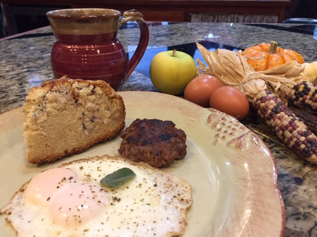 I just happen to have some just made moose breakfast sausage, Wisconsin sharp cheddar cheese, fresh sage growing in a little pot in the window, fresh farm eggs, home-made apple butter and some tart Homer apples. I know what our breakfast will be one day this weekend served with these delicious seasonal scones.