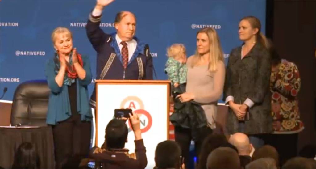 AFN delegates interrupted the regularly scheduled agenda after Walker’s address in order to deliver a series of speeches praising and thanking Walker for his actions as governor. In particular, the delegates thanked him for his apology for colonialist actions by the state and territorial government.