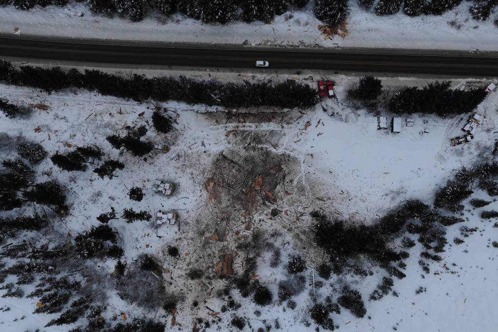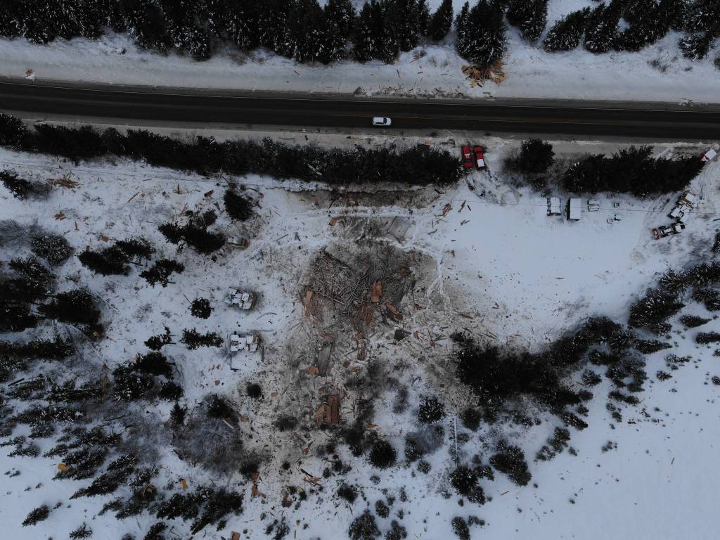 An aerial drone photo shows the extent of the explosion of a house that blew up on Dec. 27, 2018, near Mile 166 Sterling Highway in Homer, Alaska. (Photo by Travis Ogden/Kachemak Emergency Services)