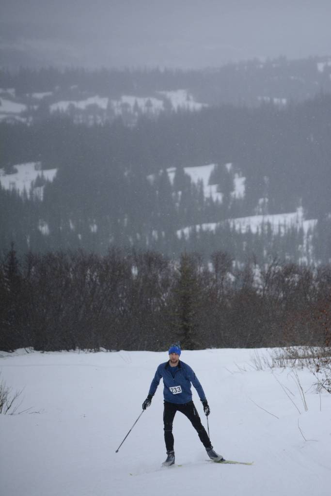 Garrett Yager of Anchorage comes up the Diamond Ridge hill in the Kachemak Nordic Ski Marathon on March 11, 2017, near Homer, Alaska. (Photo by Michael Armstrong/Homer News)