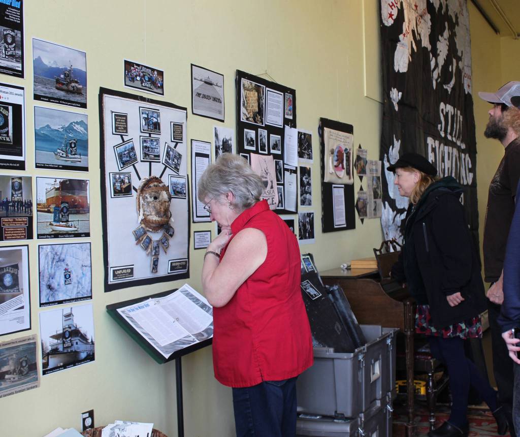 Bracketing the exhibit are two large banners made by Muller. The black fabric on which they’re made was scraps of material used to create booms to protect beaches from the encroaching flood of Exxon Valdez oil. One banner declares “Alaskans still fighting for the earth” and the other reads, “Still fighting for Alaska.” They, along with banners Muller made for Alaska communities impacted by the spill, have been unfurled on numerous occasions. On the one-year anniversary of the spill, they were displayed on vessels in Coronado Bay, Calif., where the damaged Exxon Valdez was taken to be repaired. More than 30 other communities in Washington, Oregon, California, Idaho, Arizona and Hawaii joined in that event by simultaneously unfurling their own banners in a show of solidarity.