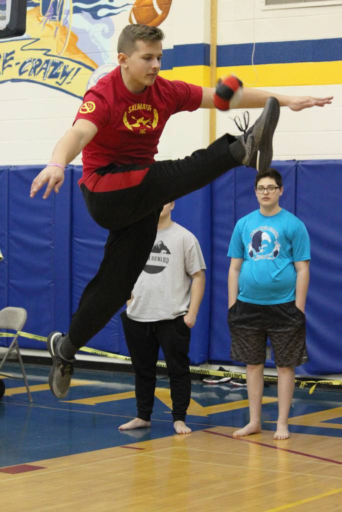 William Wilson, 13, performs the one-foot high kick Saturday, March 30, 2019 during the Kachemak Bay Traditional Games held at Homer High School in Homer, Alaska. (Photo by Megan Pacer/Homer News)