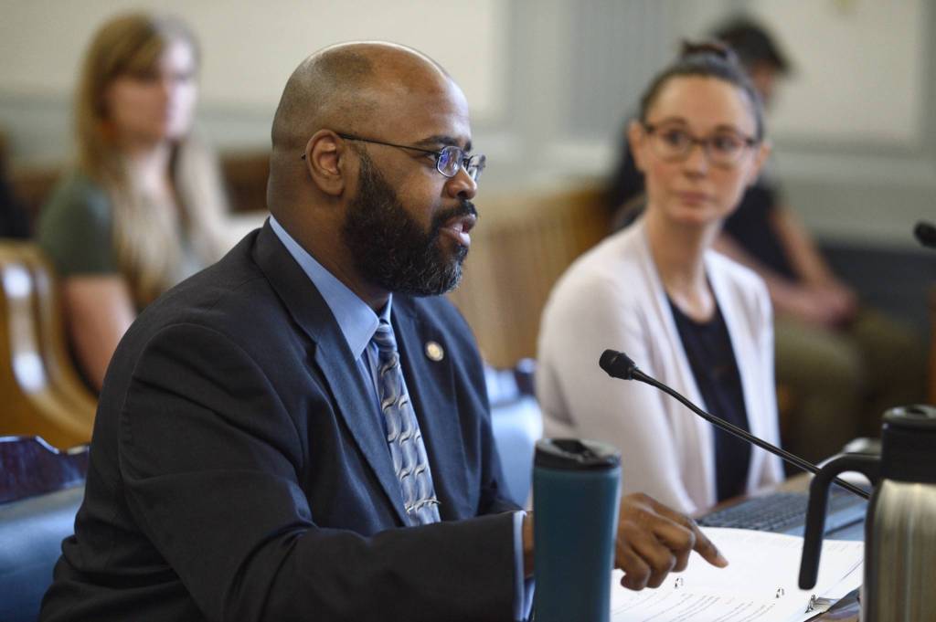 Sen. David Wilson, R-Wasilla, speaks about his bill to allow residents to donate their Permanent Fund Dividend back to the state’s general fund during a Senate Finance Committee meeting on Monday, April 15, 2019 in Juneau, Alaska. Anne Weske, Director of the Alaska Permanent Fund Dividend, right, also spoke to the committee. (Michael Penn | Juneau Empire)